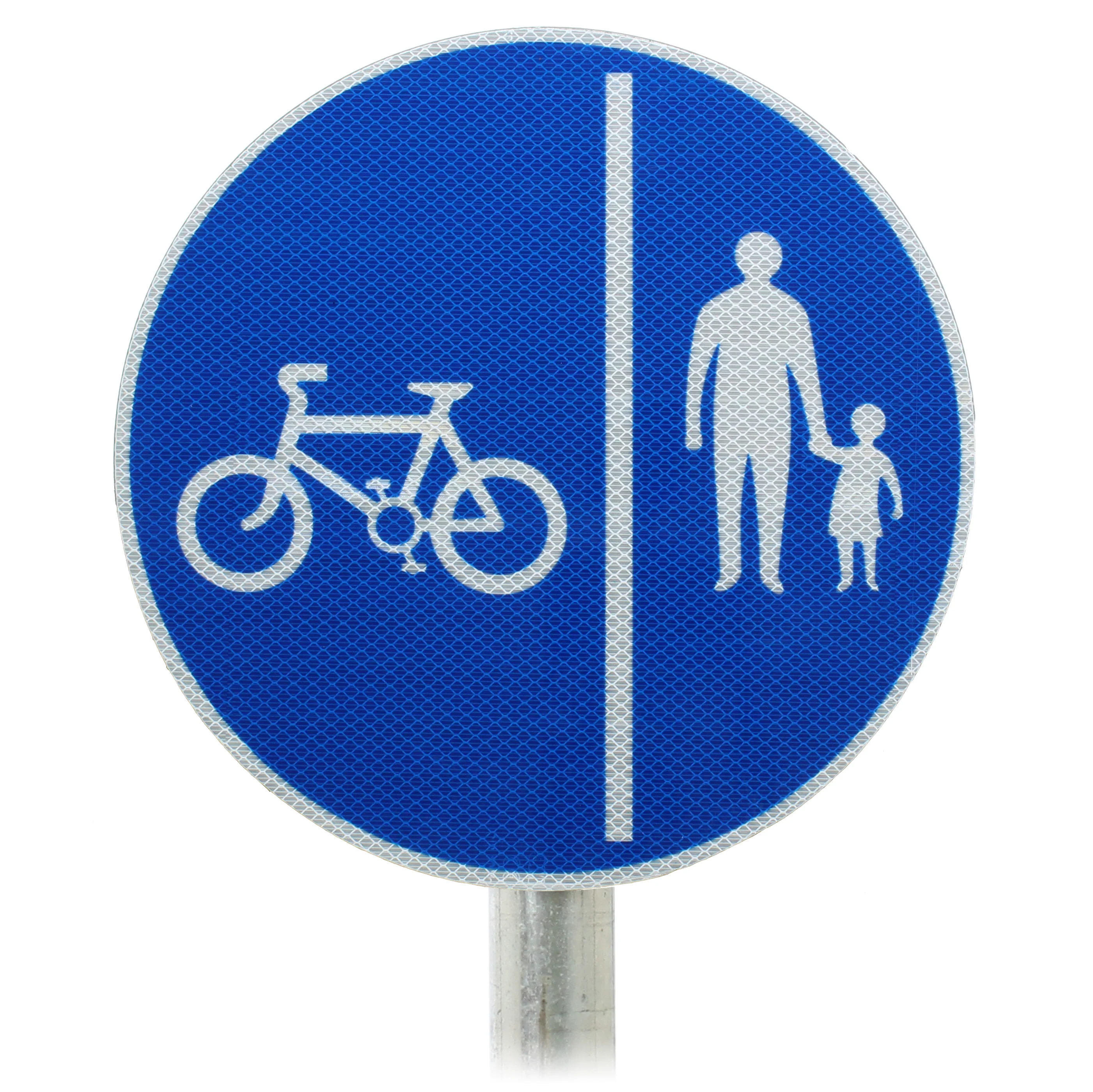 This sign is part of our permanent post mounted sign range and is used to show that a route is for cyclists and pedestrians only. It should be used on routes where pedestrians and cyclists are segregated by a central line. The sign dictates which side of the line cyclists should ride and where pedestrians should walk. In this case, 957B cyclists are to “keep left”.