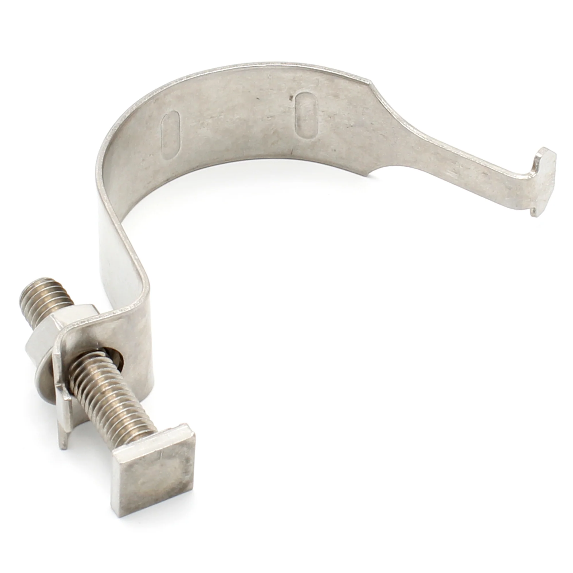 This clip is designed to be used specifically with 50mm poles, 60mm, 76mm (3” diameter), 89mm, 114mm and 140mm poles. Two of these are required to mount one post mountable sign, each clip securing one rail to the pole via a nut and bolt mechanism.